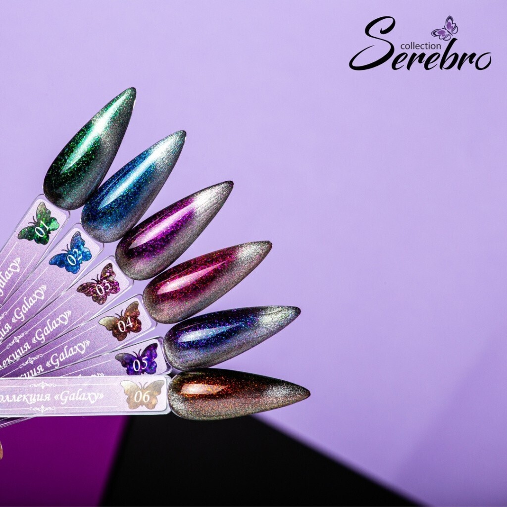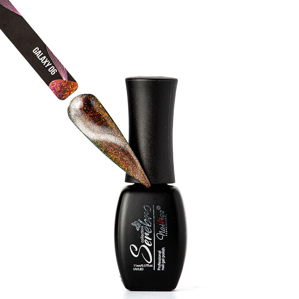 Магнитный гель-лак на прозрачной подложке, с золотисто-оранжевыми и серебристыми микроблестками.