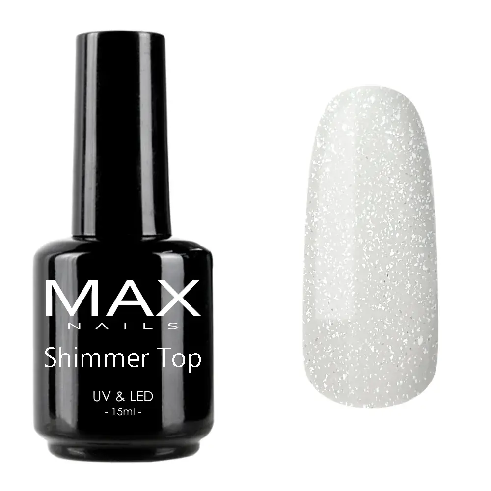MAX Nails Shimmer Top - топовое покрытие с деликатным шиммером, средне-жидкой консистенции, без липкого слоя, с УФ-фильтром.