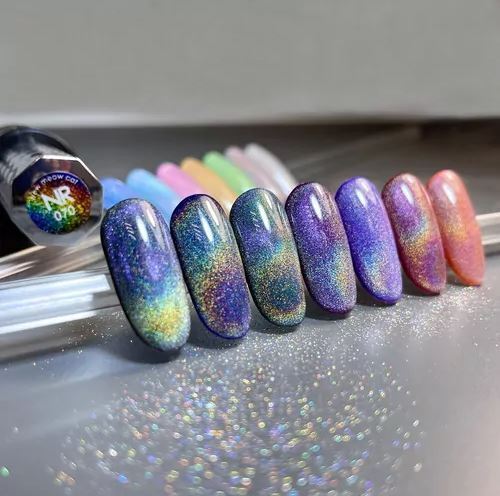 Металлические частицы в составе гель-лака создают яркий, хорошо выраженный эффект призмы на ногтях. WOW-MEOW раскрывается совершенно по-разному в зависимости от подложки.