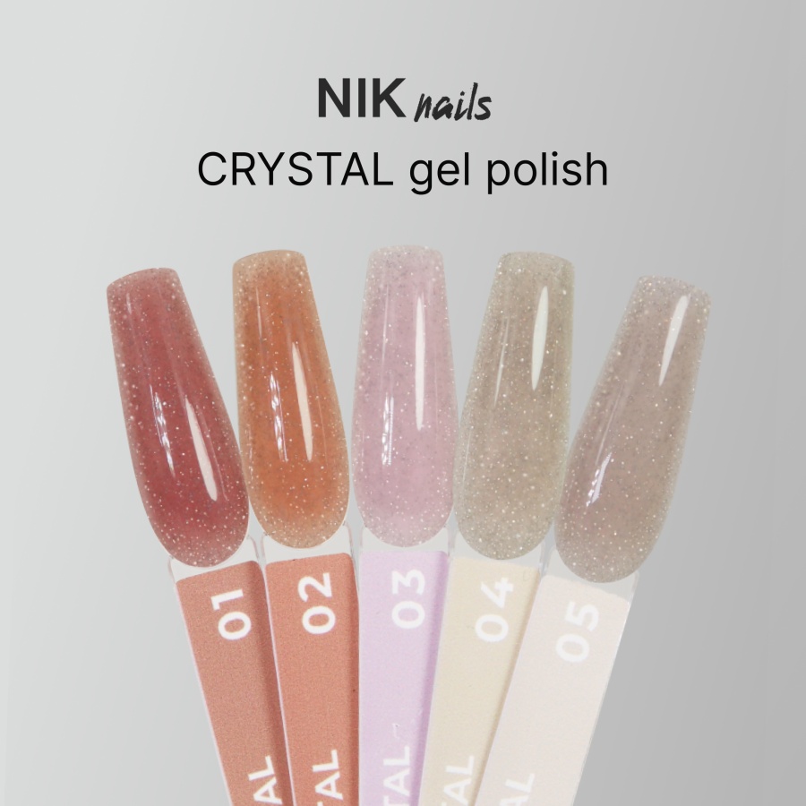 Коллекция гель-лаков Crystal состоит из нюдовых оттенков, пронизанных светоотражающими частицами.