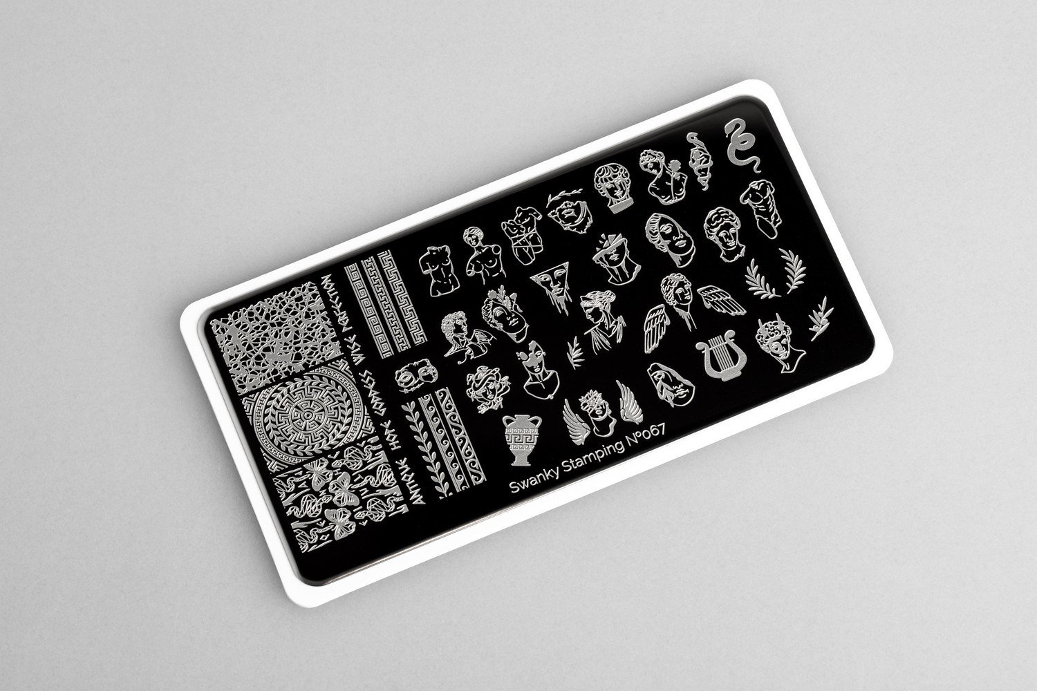 Античная пластина. Статуи, венки, вазоны, античные орнаменты и шрифты, все элементы пластины отлично сочетаются между собой создавай уникальный дизайн на ногтях.